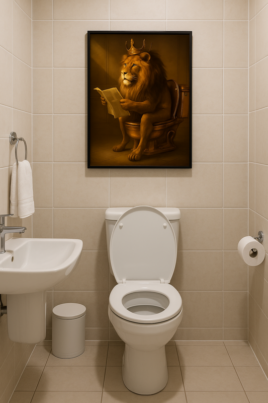 König der Keramik Poster | Lustige Gäste-WC Deko | Löwe auf goldener Toilette