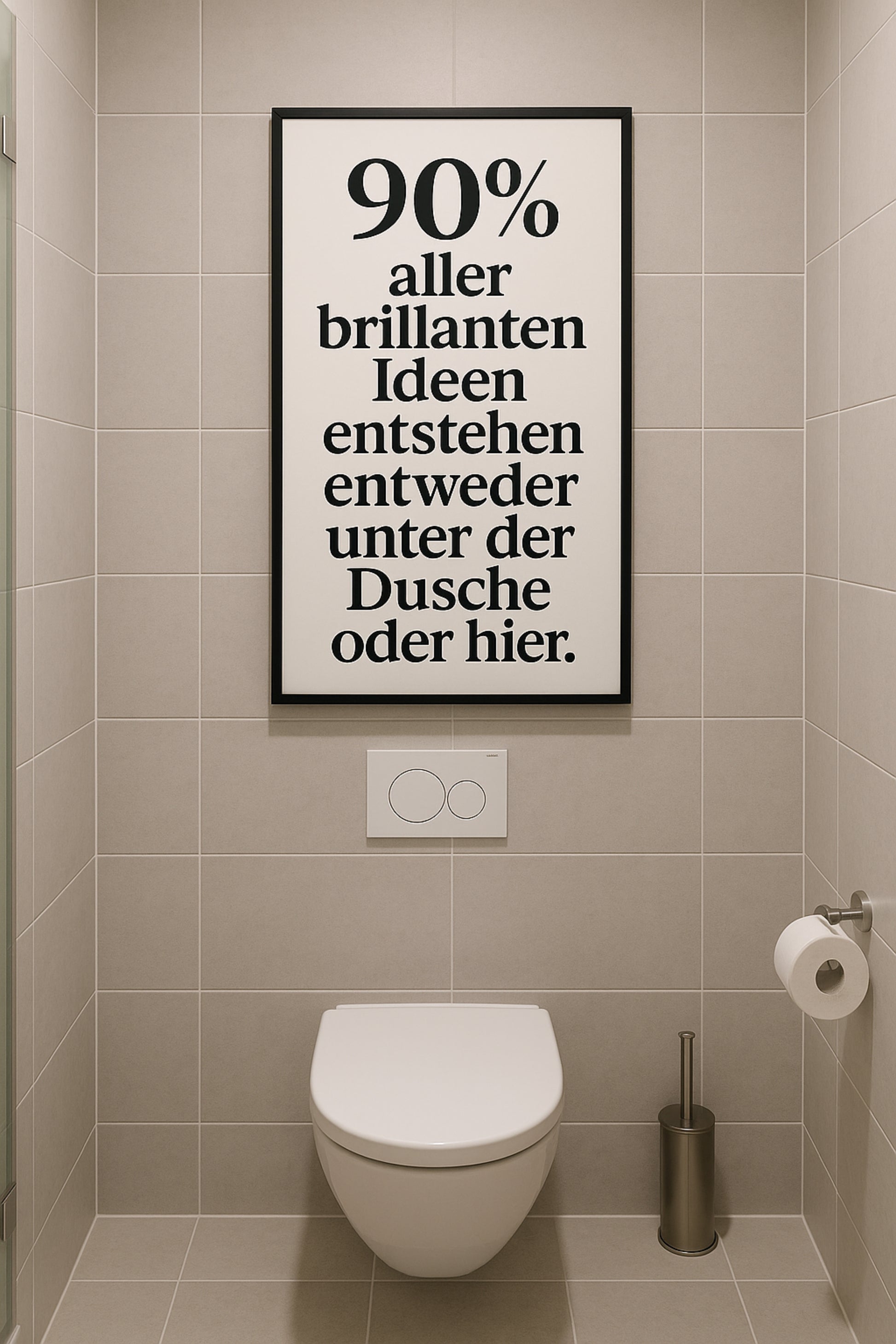 Ob unter der Dusche oder auf dem stillen Örtchen – brillante Gedanken brauchen Raum. Dieses witzige Toilettenposter bringt den Geistesblitz direkt an die Wand und sorgt garantiert für Schmunzler bei jedem Besuch. Perfekt als humorvolle Gäste-WC Deko, Geschenkidee oder stilvolles Statement im Badezimmer. Für alle, die mit einem Augenzwinkern kreativ sind.