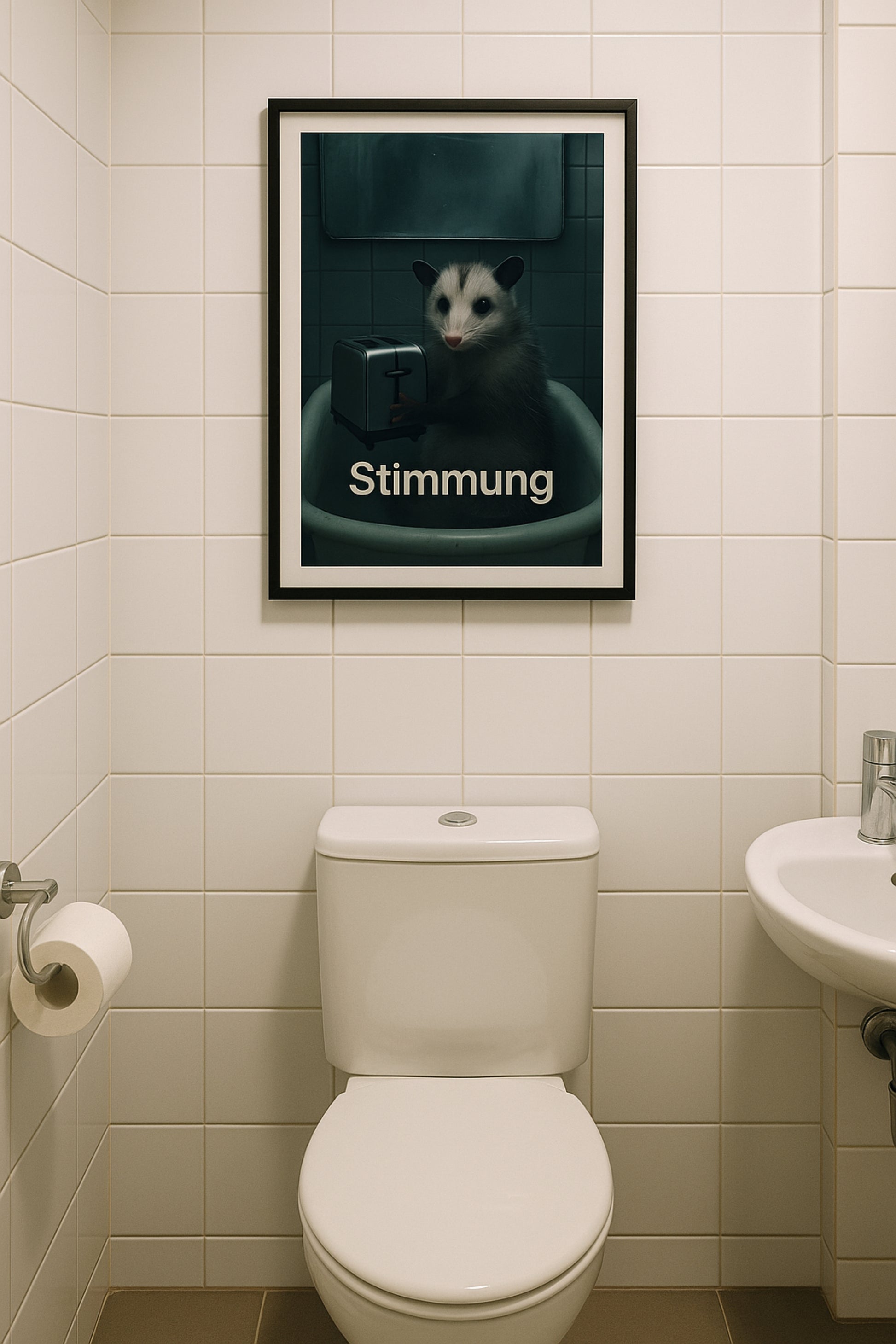 Wenn die Stimmung… na ja… einfach da ist. Dieses Toilettenposter mit schwarzem Humor trifft den Nerv aller, die Ironie lieben – und sich nicht vor ein bisschen Grenzüberschreitung scheuen. Das Opossum mit Toaster im Wasser und dem lakonischen Titel „Stimmung“ ist mehr als ein Witz – es ist eine visuelle Therapie gegen den Alltagswahnsinn. Ideal für WG-Klos, Gamerbäder oder als Statement für Menschen mit trockenem Humor. Gedruckt auf mattem Premium-Papier, hochwertig, düster, brillant.